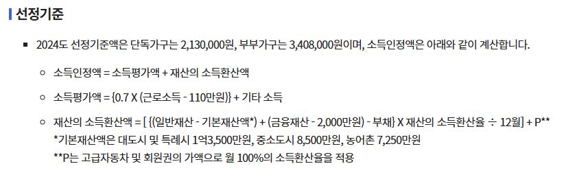 - 2025년 선정기준액은 2024년 대비 15만 원 증가했습니다. 이는 65세 이상 노인의 근로소득과 공적연금 소득이 각각 11.4%, 12.5% 상승한 영향으로 분석됩니다.